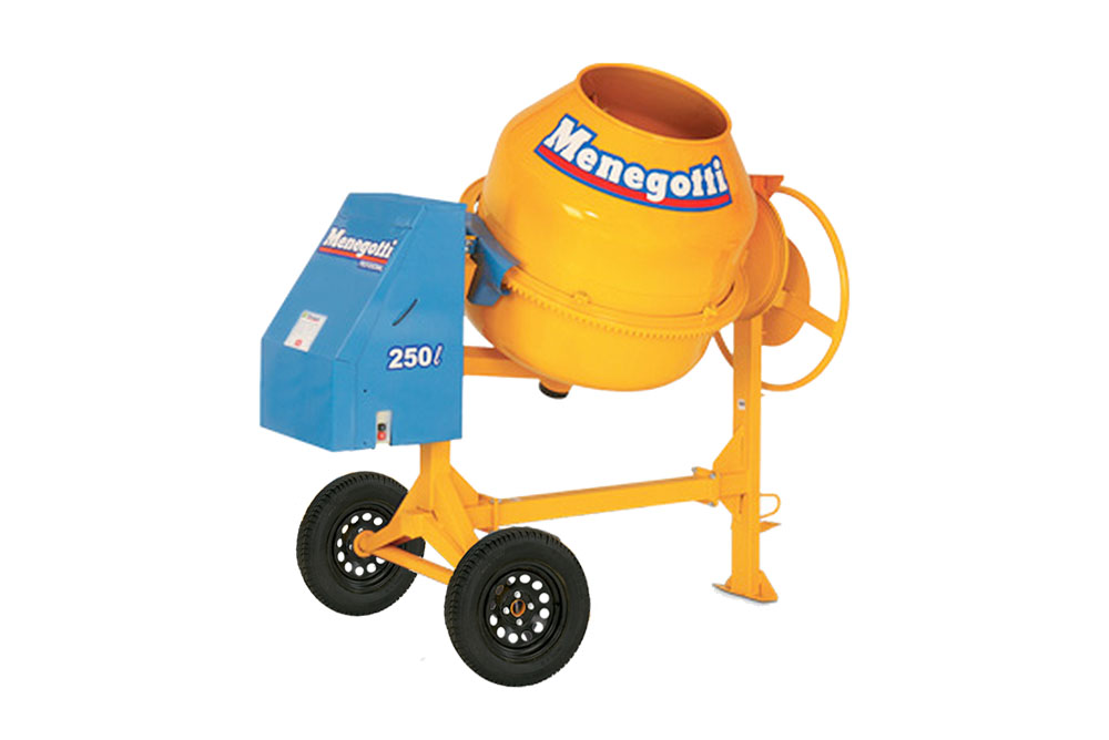 Las Mezcladoras Menegotti contienen un tambor con chapa de acero de 2,0 mm de espesura, pintura electrostática de alta resistencia a la intemperie, componentes en hierro fundido FC200 de alta resistencia.