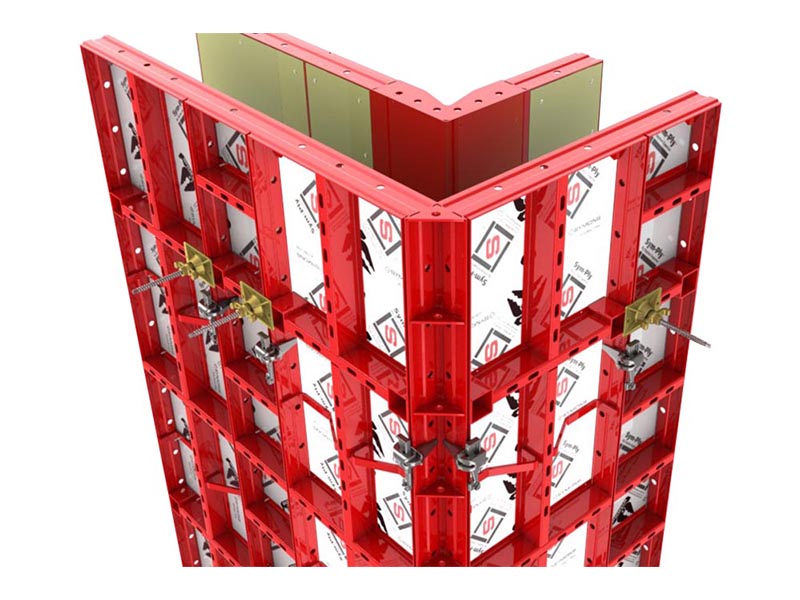 Los paneles de Sym-Ply incorporan madera multilaminar de 5∕8" con capa de alta densidad de 100/30, cubierta de acero de 80 ksi, de alta resistencia y 4" de profundidad. El resultado es un sistema de encofrados de alta capacidad (presión permitida de 1,500 psf) y de peso ligero. El tirante perfilado tiene una forma que permite el acoplamiento y tiene agujeros de 13∕16" de diámetro para colocar el perno de anclaje directamente al Steel‑Ply.